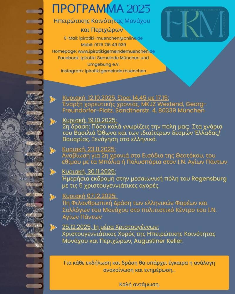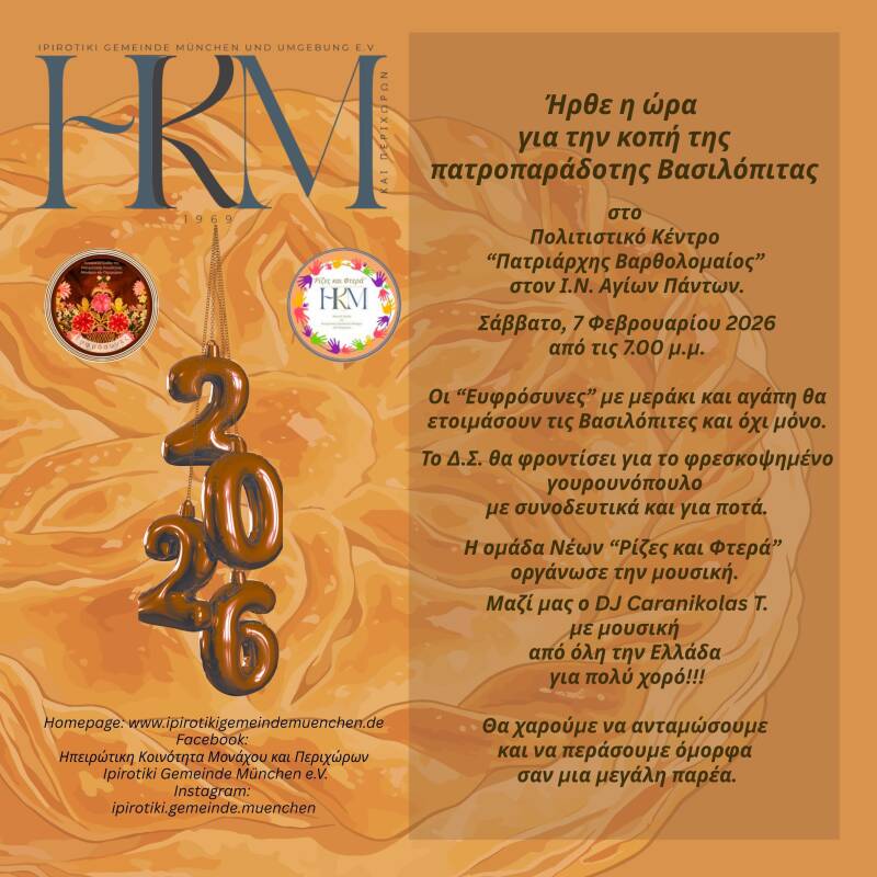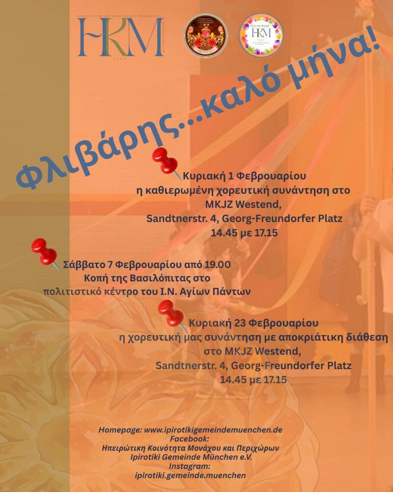 Die Ipirotiki Gemeinde München und Umgebung e.V. ist ein Verein, der sich der Pflege und Weitergabe der Kultur, des Tanzes, der Musik und des Brauchtums von Ipiros verschrieben hat. Seit 1969 bieten wir unseren Mitgliedern und Freund*innen ein Stück Griechenland, ein Stück Ipiros in München an.